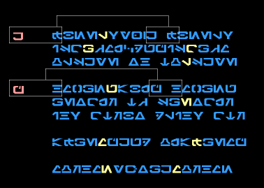 So the bad news here is that, once we've filled in all the blanks, we still don't know what these screens say. But that doesn't really matter anymore. The screens, as we see them, are just made up of letters selected from a block of text. It's highly improbable to generate meaningful words by randomly breaking up and subtracting letters from larger words. What's more likely is that the words on these screens are simply there to provide a little atmosphere.