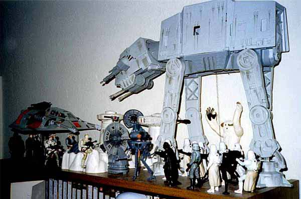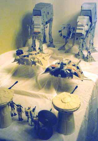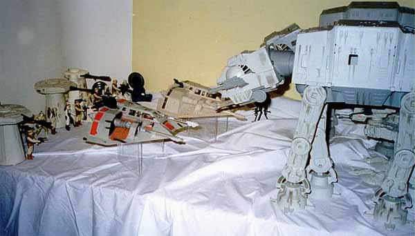 No respectable display of dioramas would be complete without the Battle of Hoth. Included in these pictures are both the 1980 and 1997 AT-ATs, as well as both old and new versions of the snowspeeder. Old and new figures are randomly thrown in as well. Here's a useful tip: by placing clear CD cases under the snowspeeders, they can seem to fly!