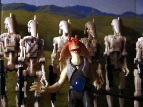 Jar Jar displays his typical heroic response when faced with a phalanx of Federation battle droids. The background behind the battle droids is from the Armored Scout Tank toy.